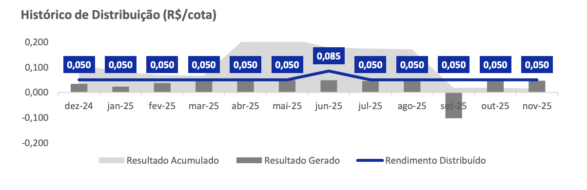 Em novembro de 2025, o VINO11 pagou R$ 0,05 por cota. Nada de mudanças bruscas: esse valor vem sendo mantido há um ano inteiro. No mês, o fundo gerou um pouco menos — R$ 0,046 por cota — mas ainda assim decidiu seguir com o repasse de R$ 0,050. Na prática, isso dá um retorno anualizado de 11,5%. Além disso, o fundo ainda fechou o mês guardando R$ 0,015 por cota em resultado acumulado que não foi distribuído.