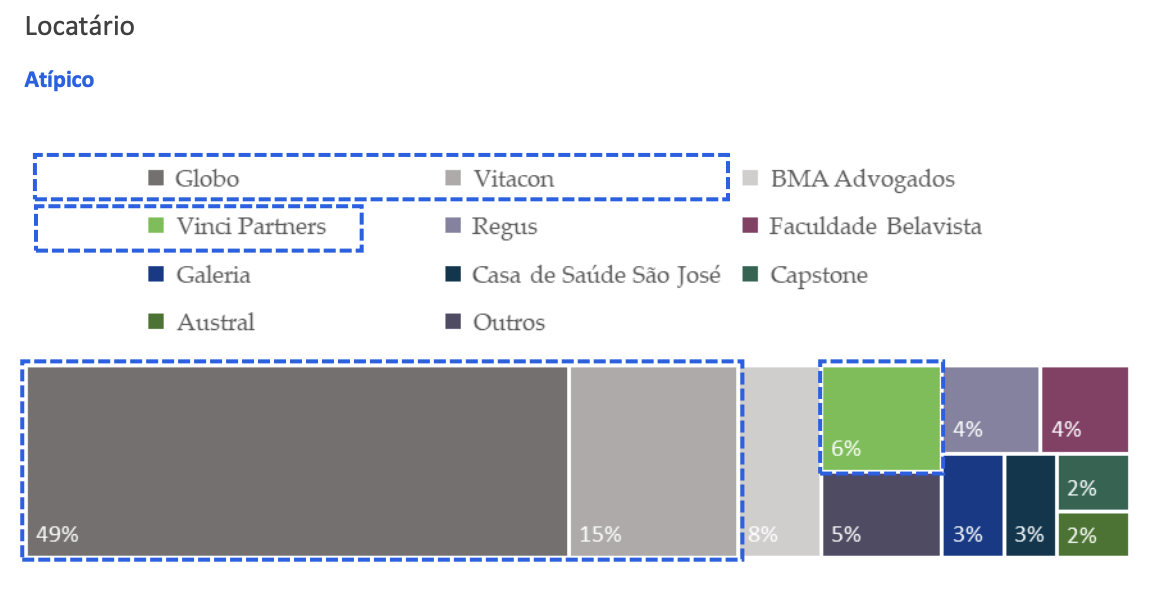 A explicação por trás disso está em como o VINO11 ganha dinheiro. Mais da metade vem da Globo. Depois aparecem empresas de construção e serviços imobiliários (15%) e o setor financeiro (8%). A própria Vinci, gestora do fundo, é inquilina de um dos imóveis no Rio de Janeiro.
