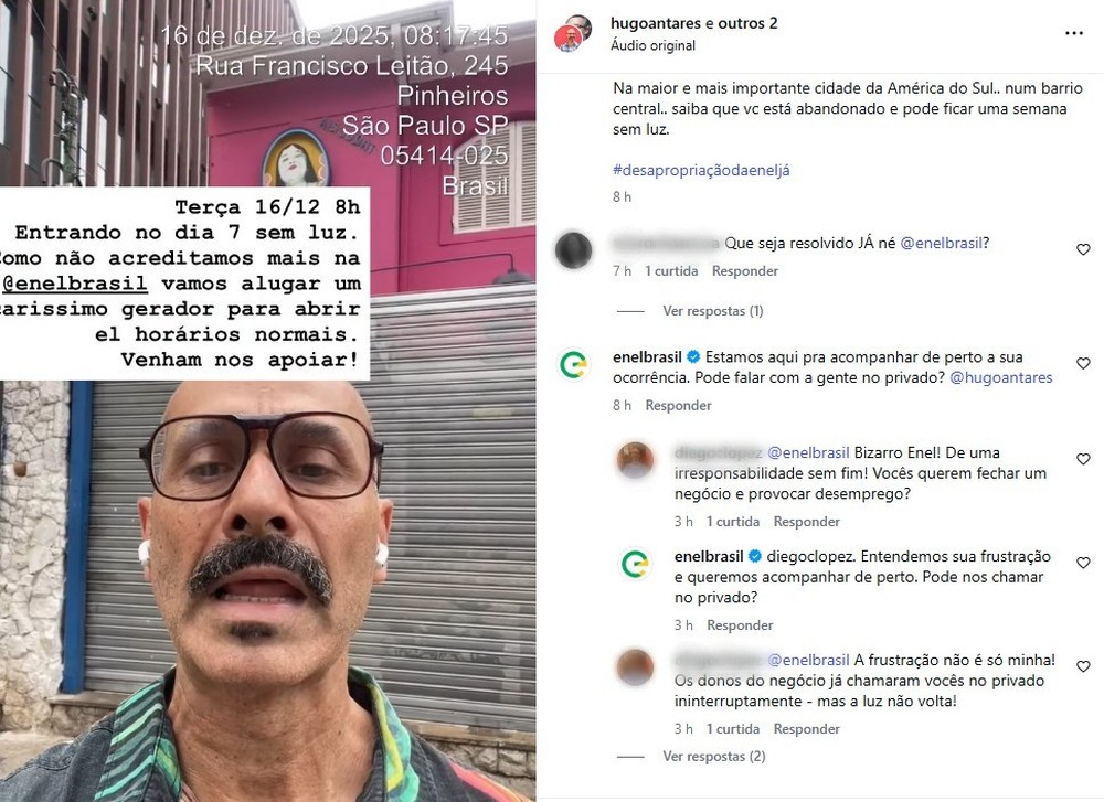 Cansado de esperar uma solução, Hugo decidiu recorrer às redes sociais. Ele começou a postar vídeos pedindo ajuda e cobrando uma resposta da Enel, empresa responsável pelo fornecimento de energia na região. A concessionária chegou a comentar em uma das publicações no Instagram, mas, até a última atualização da reportagem, a energia ainda não tinha voltado.
