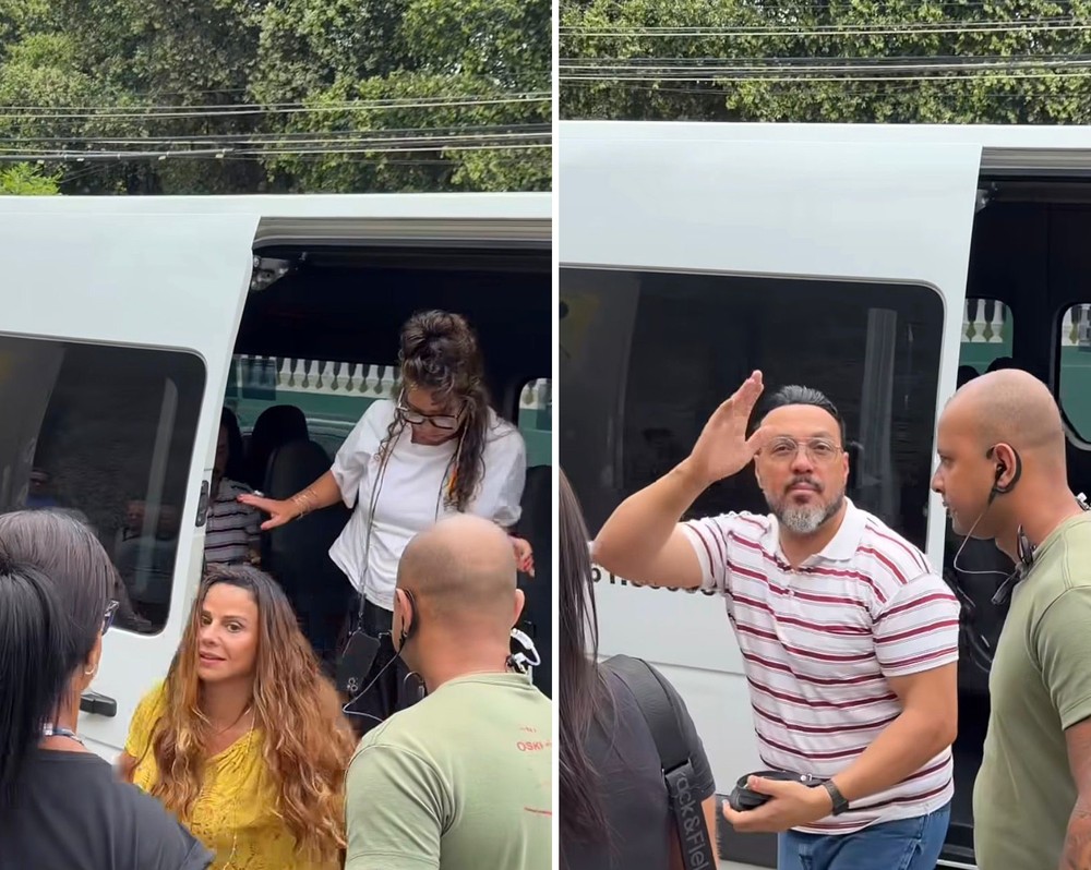 | Belo e Viviane Araújo chegam juntos em van para gravar externa de 'Três Graças' — Foto: Reprodução/Instagram |